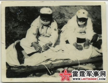 护士官义芝(左)和何成君在为黄继光遗体裹白布。